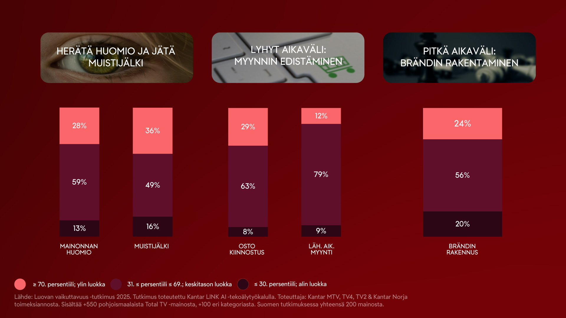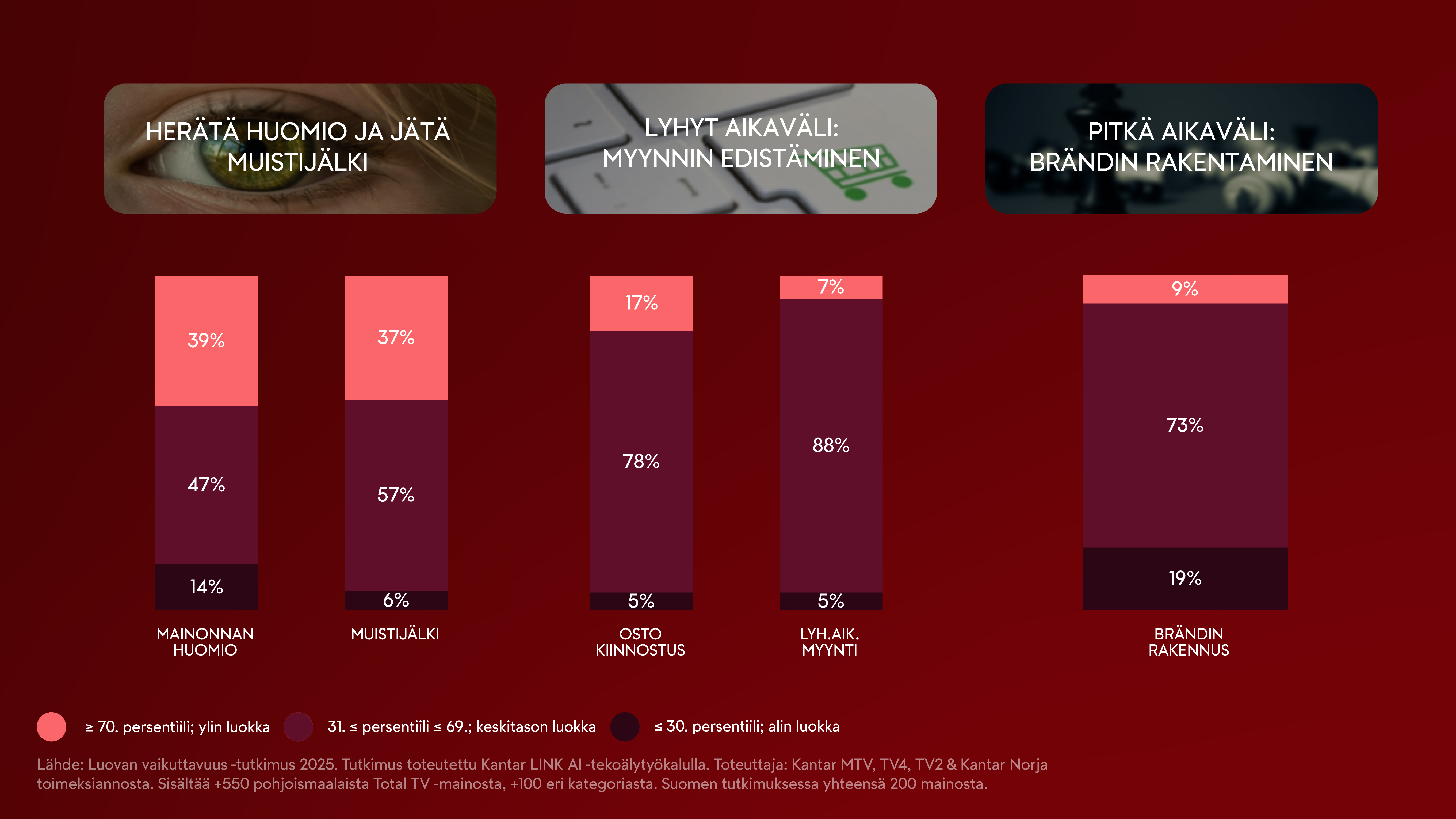 *Luovan vaikuttavuus -tutkimus 2025. Tutkimus toteutettu Kantar LINK AI -tekoälytyökalulla. Toteuttaja: Kantar. Toimeksiantajat: MTV (Suomi), TV4 (Ruotsi), TV2 (Tanska), Kantar (Norja). Sisältää +550 pohjoismaalaista Total TV -mainosta, +100 eri kategoriasta. Suomen tutkimuksessa yhteensä 200 mainosta.