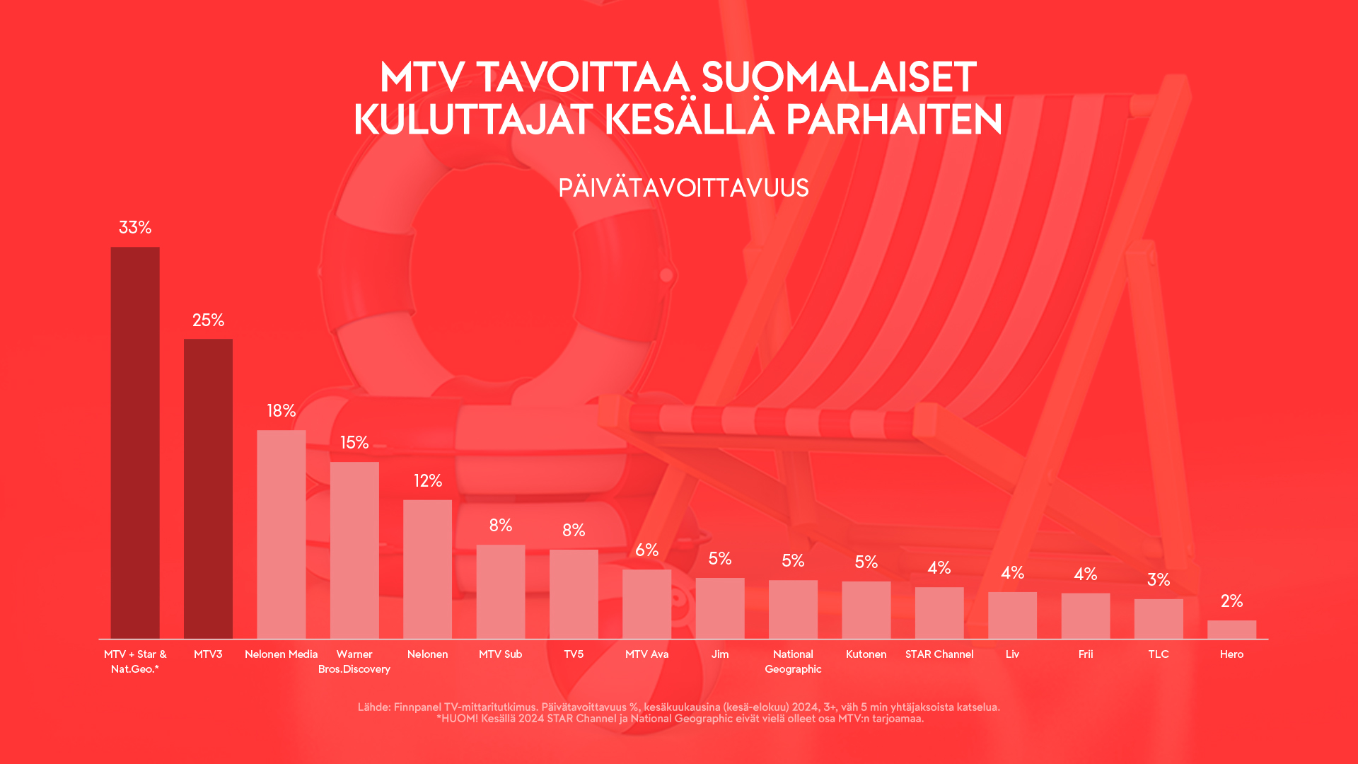 *Lähde: Finnpanel, Total TV -mittaus. MTV:n Total TV (sis. MTV3, MTV Sub, MTV AVA, MTV Katsomo, MTV Katsomo+, National Geographic, STAR Channel), keskimääräinen päivätavoittavuus +3-vuotiaissa, 1.6. – 31.8.2024, väh. 5 min yhtäjaksoista katselua.