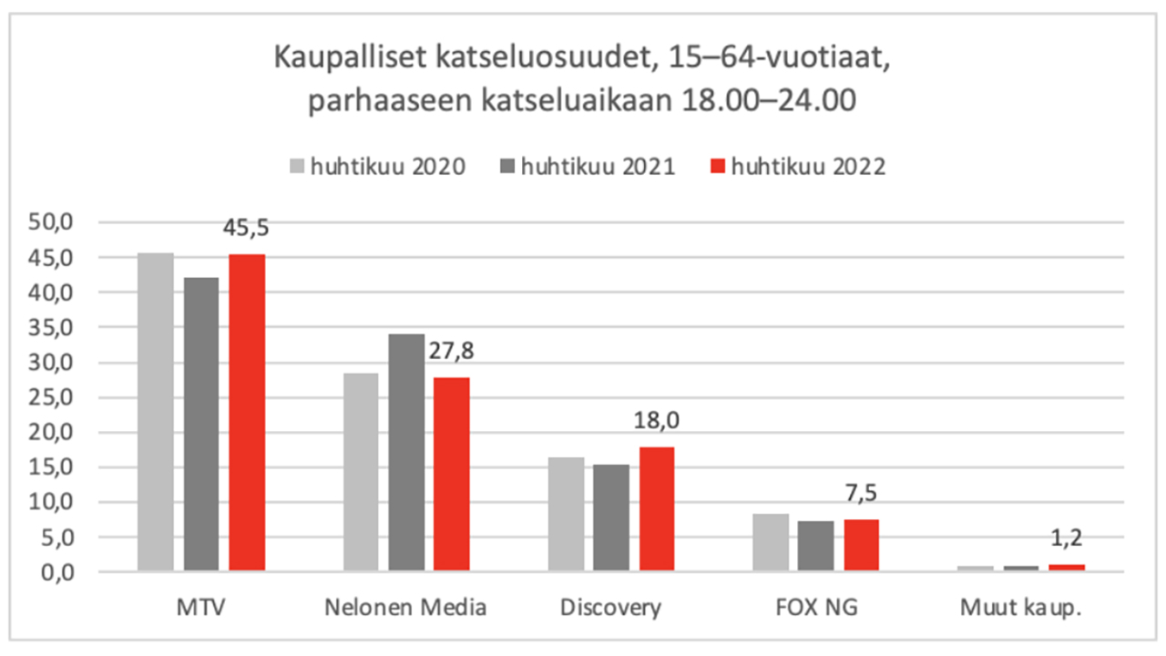 MTV on ollut selvästi katsotuin kaupallinen tv-yhtiö Suomessa kolme viimeisintä huhtikuuta peräkkäin. Tämän vuoden huhtikuussa MTV:n kaupallinen katseluosuus 15–64-vuotiaissa parhaaseen katseluaikaan oli todella korkea 45,5 % – siis lähes huhtikuun 2020 tasolla (45,7 %).