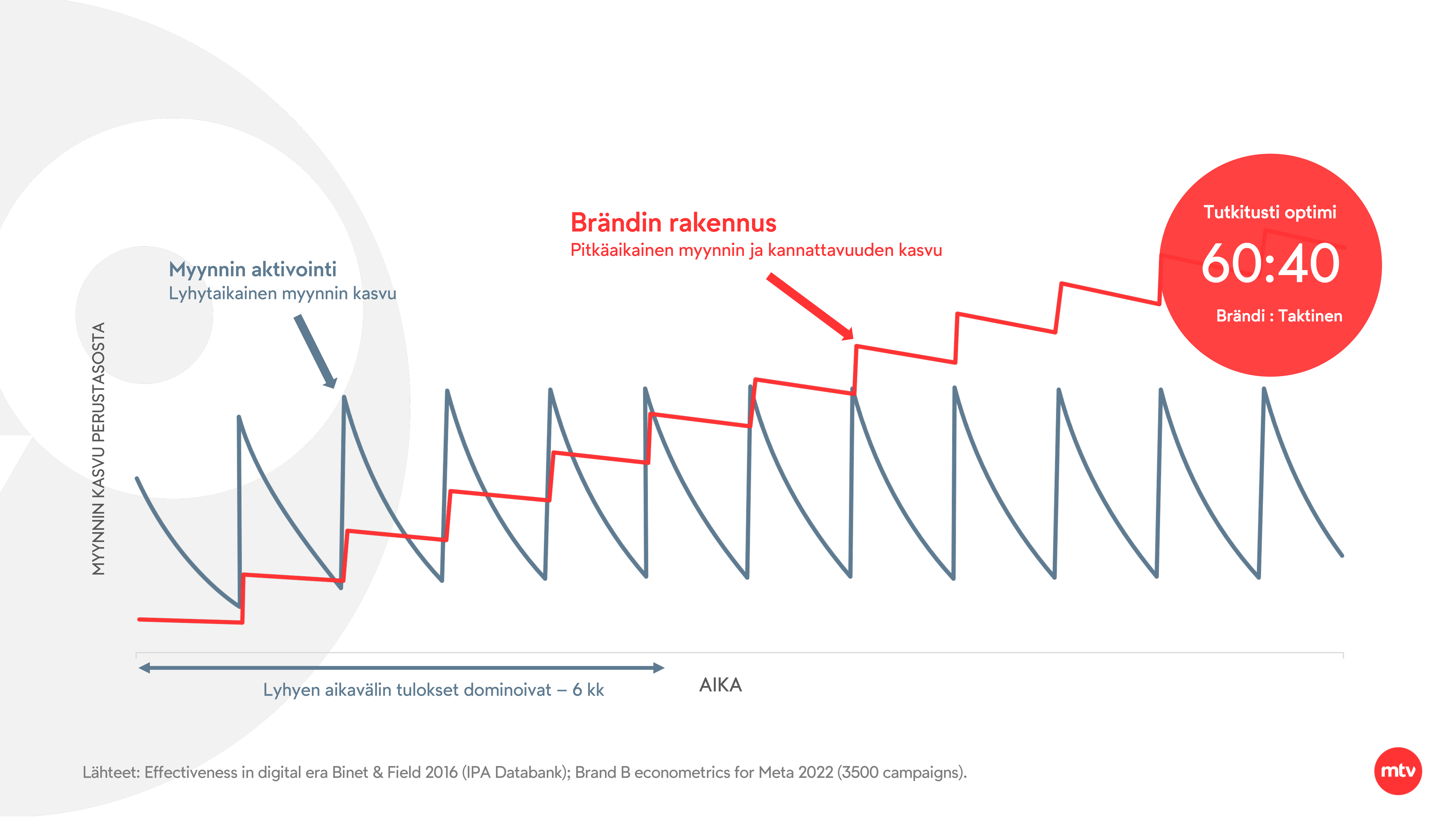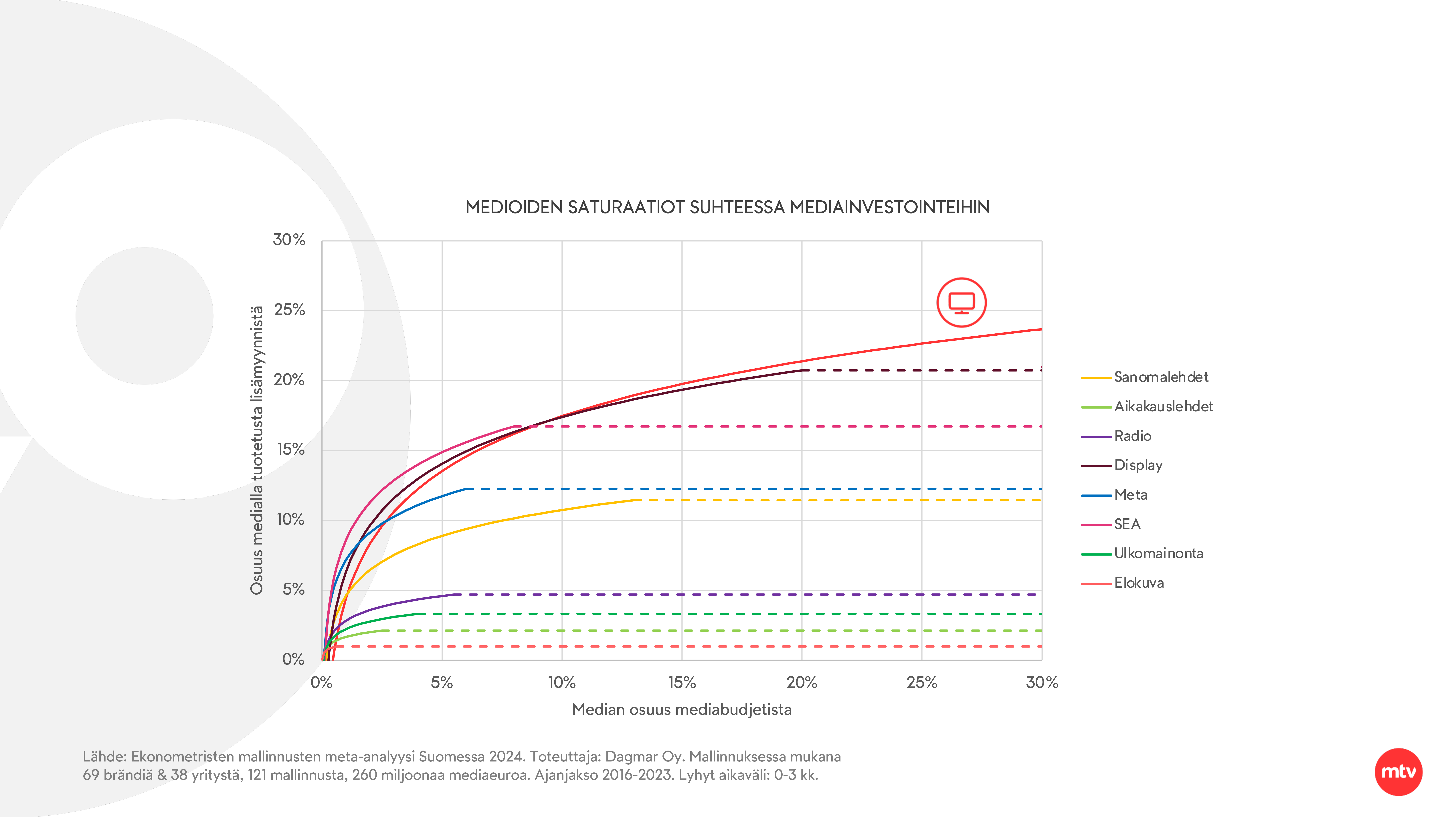 [4] Ekonometristen mallinnusten meta-analyysi Suomessa 2024. Toteuttaja: Dagmar Oy. Mallinnuksessa mukana 69 brändiä & 38 yritystä, 121 mallinnusta, 260 miljoonaa mediaeuroa. Ajanjakso 2016-2023. Lyhyt aikaväli: 0-3 kk.