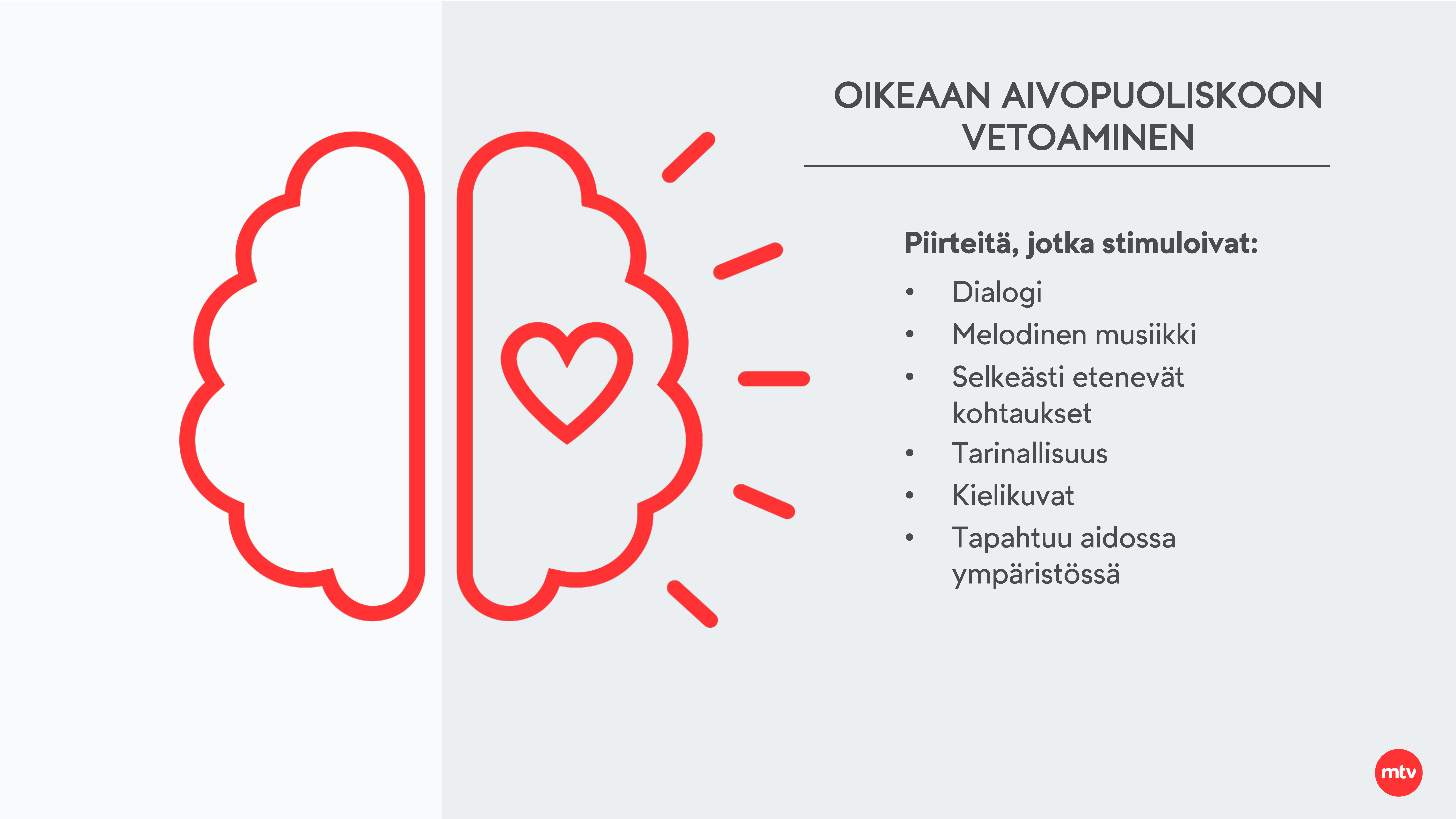 Tutkimukset osoittavat, että tunteita herättävä mainonta tuottaa suurempia liiketoiminnallisia vaikutuksia kuin pelkästään rationaaliseen puoleen vetoava mainonta [7]. Tunteita säätelevään oikeaan aivopuoliskoon pystytään vaikuttamaan muun muassa tarinoilla, melodisella musiikilla, dialogilla, kielikuvilla, väreillä, aidoilla ympäristöillä, eläimillä sekä selkeästi etenevällä tarinankerronnalla [8]. Näiden elementtien käyttö mainonnassa herättää enemmän tunteita kuluttajassa, mikä tarkoittaa myös korkeampaa huomioarvoa.