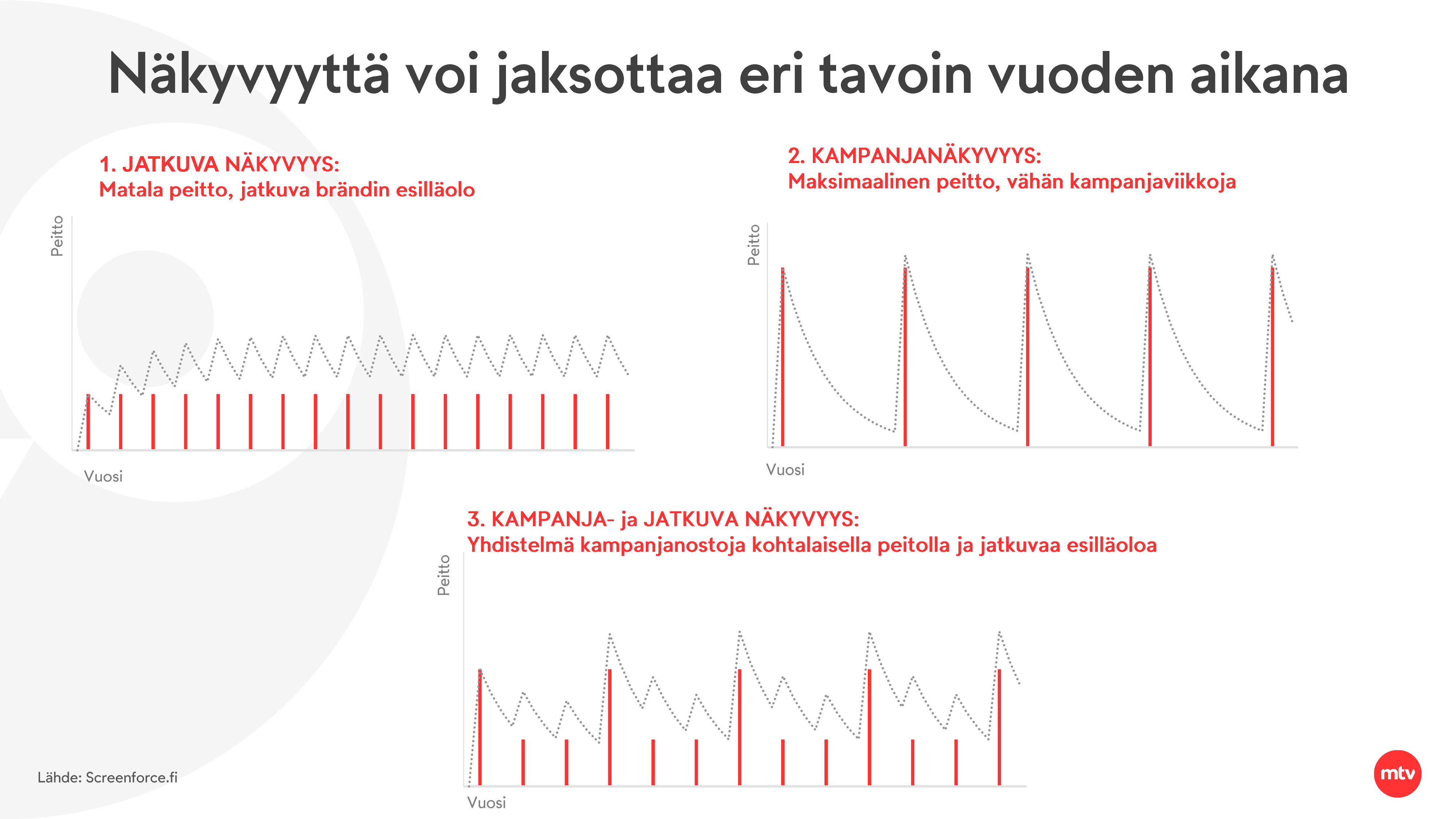 Vuosisuunnittelu on paljon muutakin kuin kampanjoiden aikataulutusta. MTV:llä strategit lähtevät suunnittelussa ennen kaikkea siitä, miten tavoitetaan mahdollisimman suuri osa kategorian ostajista vaikuttavasti, oikeaan aikaan ja oikeissa kanavissa. Sama euromäärä voidaan käyttää hyvin eri tavalla riippuen siitä, mitä tavoitellaan.